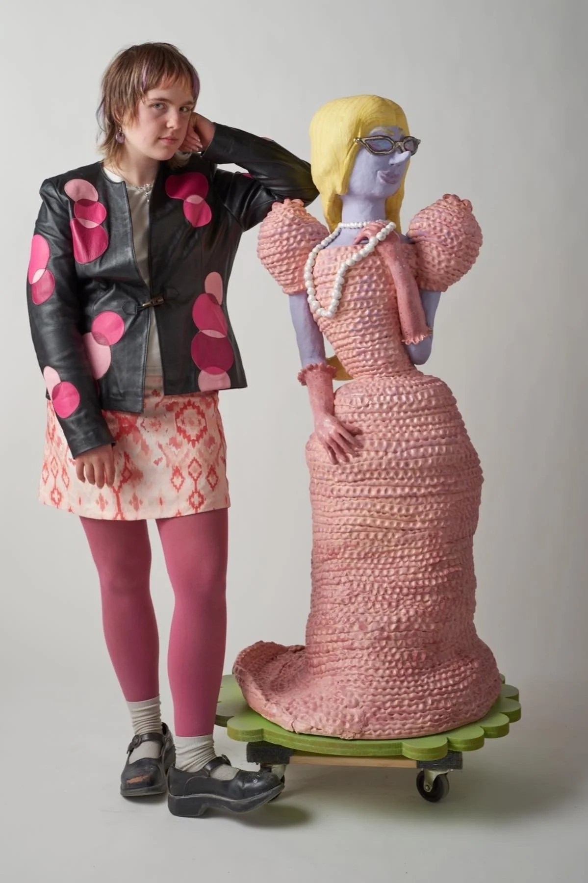 I transform the characters found in these drawings into ceramic figures that range in scale from doll size to life size. With coils of clay, I build from the ground up. I pinch successive rows to create a frilly, scalloped surface through the pieces, embracing the elements of chance as I work. Clay is a material that sometimes has its own mind. My forms may slump as they please, while I also hold onto a modicum of control to keep the structure from cracking and self-destructing.The overstimulating qualities of the vulnerable, yet sassy figures, the exuberant textures, bright colors, and devotion to maximalism aim to elicit childhood memory and to transcend beauty into rotten excess.